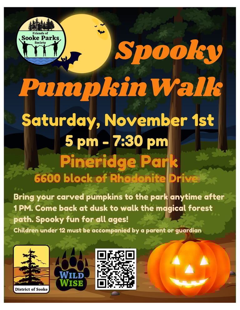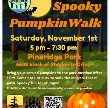 The Friends of Sooke Parks Society (FSPS) hosted a Spooky Pumpkin Walk event at Pineridge Park on Wednesday, November 1 from 5pm - 8pm. We received over 300 pumpkins and 200+ attendees making the evening a huge success.
