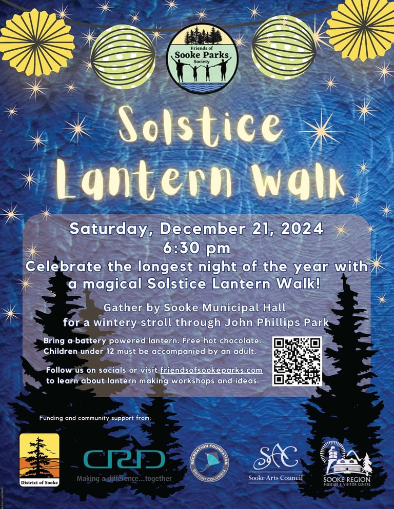 The Friends of Sooke Parks Society hosted Sooke's first ever Solstice Lantern Walk for the longest night of the year on December 21. There were amazing homemade lanterns, lots of happy voices, and a beautiful first winter evening.